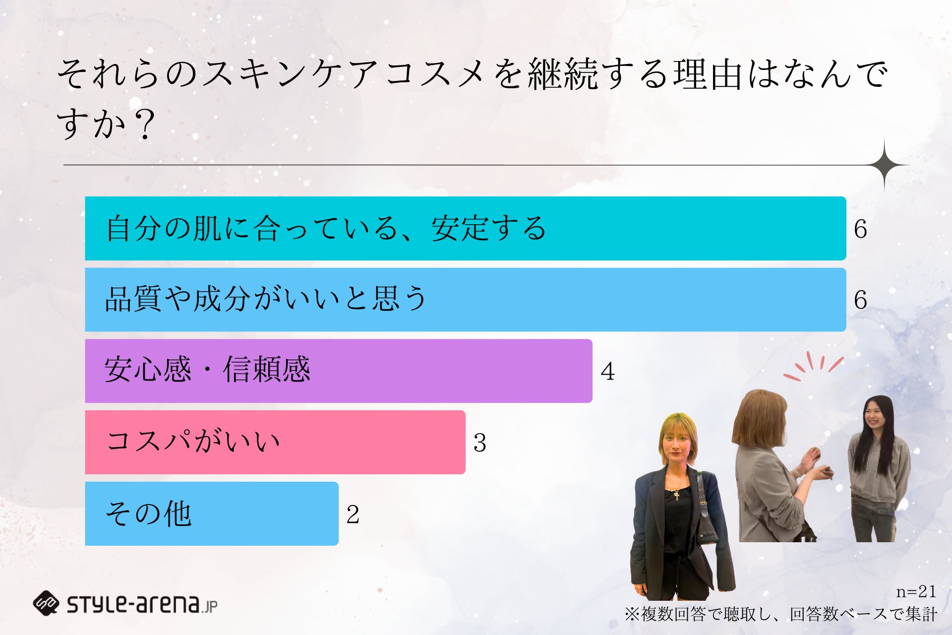 そこで、ファッション・ビューティ分野のリアルトレンドを発信する「スタイルアリーナ」ではZ世代の女性たちの“静かなる信頼”をよせる美容習慣とスキンケアコスメ事情を探るため、おしゃれに敏感な若者が行き交う表参道で街頭調査をインタビュー形式で実施。