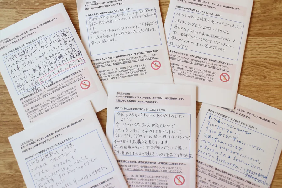 自分の洋服のスタイルに合わせてスタイリストがセレクトした一押しのアクセサリーと手紙で、単にアクセサリーをレンタルしているのとは違う感覚。自分だけに向けられたスタイリストからのアドバイスが何とも嬉しく楽しい。また、実際に気に入ったアイテムは最大80%OFFで購入できるのも嬉しい。アイテム一つ一つ丁寧に消毒・クリーニングを行ない、アイテムによってはキャッチを毎回交換しているため、衛生面も安心。(※アレルギー対応アクセサリーもあり)