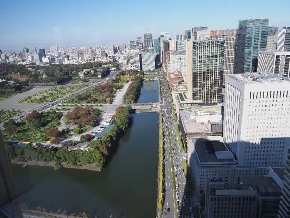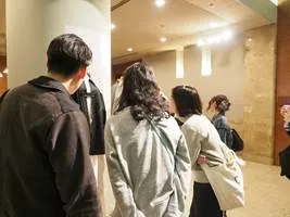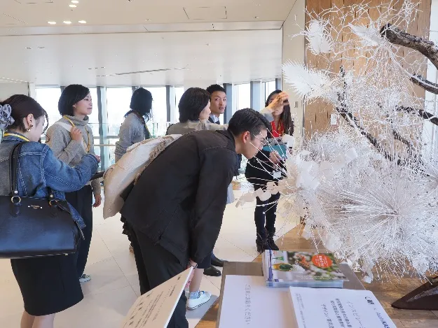 12時50分。東京ミッドタウン日比谷9階のロビーに集合。入館用ICカードを受け取り、いざオフィスフロアへ。旭化成本社29階のエントランスを入ってまず驚かされるのが、フロアを囲む大きな窓から望む抜群の展望! 隣接する皇居や日比谷公園、ペニンシュラホテルはもちろん、遥か関東山地までの関東一円が眼下に広がる大パノラマでした。フロア中央には広々とした受付があり、その横には待合スペースのほか、旭化成グループが開発するコア技術の数々が展示されたスペースもあります。こんな素晴らしい環境でわたしも仕事ができるようになりたいと、受講生がつぶやいておりました。ゆるやかにらせんを描く内階段をのぼり、いよいよ30階のベンベルグ裏地ミュージアム+(プラス)に入館です。
