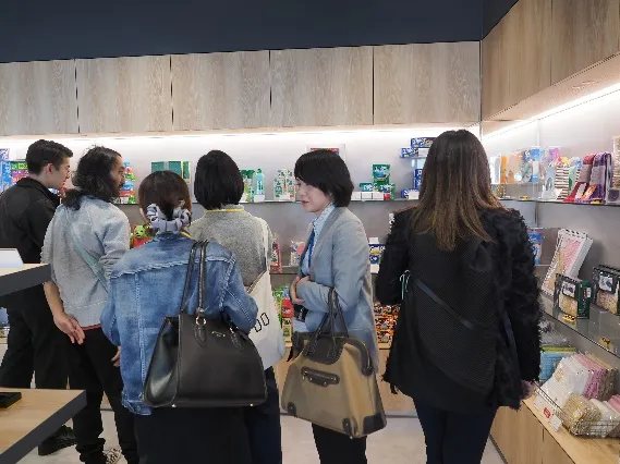 11月15日(木曜)、3回目の講義は、東京ミッドタウン日比谷(旭化成本社内)にリニューアル・オープンしたばかりの「ベンベルグ裏地ミュージアム+(プラス)」の視察からスタートです。この施設は ”旭化成の創業以来、脈々と受け継がれて来た「ベンベルグ」裏地の歴史と伝統を振り返りつつ、現在の姿を通して裏地の未来を考える場”として2014年に千代田区神保町にあった旧旭化成本社に開設。本年11月の本社移転にともない、日比谷に移って来ました。今回ラボ受講生は、3班に分かれてこちらの施設を順次見学し、ベンベルグの歩みを勉強していきます。