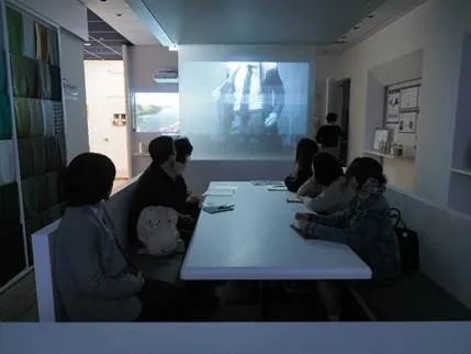 挨拶が終わり、次にベンベルグの基本機能(吸放湿性・滑り・制電性)の解説動画と、イタリアの高級スーツブランド・キートンと製作したプロモーション動画を視聴。内容はもちろんですが、この映像を映し出す最新のデジタル機器に、受講生もおもわず感嘆の声をあげるほどの充実ぶりでした。