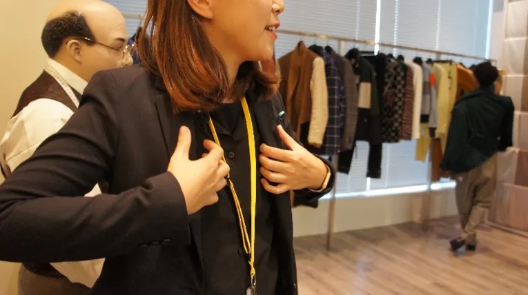 続いて、旭化成マーケッティング室の前田舞子氏から裏地ミュージアムについての説明。「この裏地ミュージアムは本社移転前の神保町で2014年に開設しました。それまでは表地と共に毎シーズン展示会を開催していましたが、裏地という商材の特性を考慮した結果、もっとお客様と密に話し合える機会の場を設けるため、このような常設展になりました。開設以来、約4,500名を超えるお客様にご来場をいただき、新たな素材の開発や、ベンベルグを深く知っていただく場所として使っていおります。」