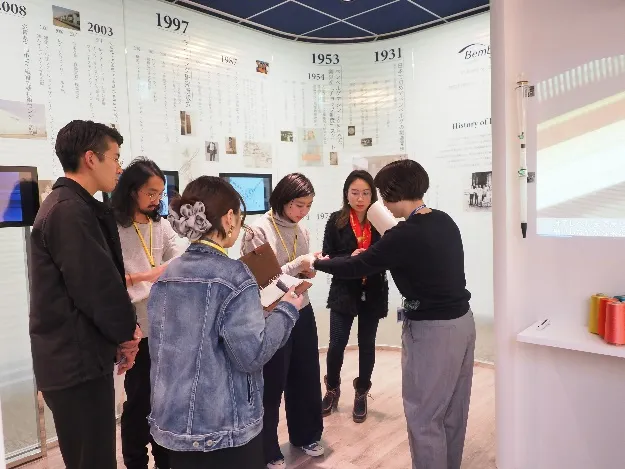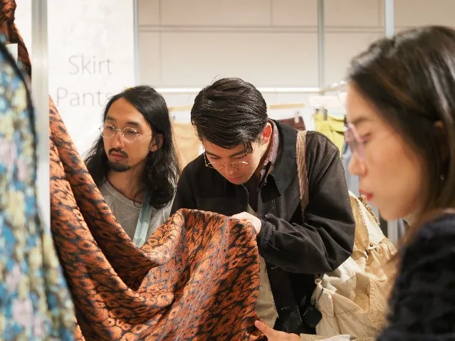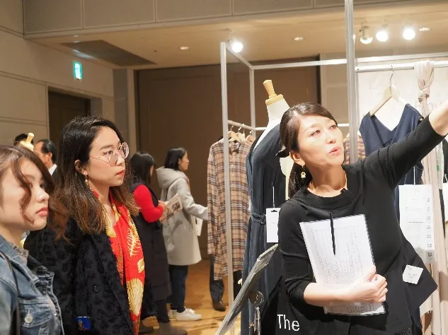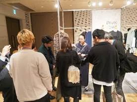 ベンベルグを用いた新作アウター素材が一堂に会す場とあって、日本全国から42社のコンバーターが参加(中国からも1社参加)。多くのアパレル関係者が来場し大盛況です。実際に商談もおこなわれているリアルな現場ですが、今回は<ベンベルグ>ラボの受講生たちのために、特別に見学することができました。