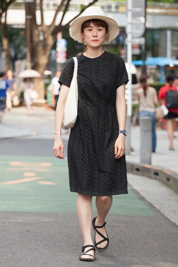 ストリートに目を向けると様々なコーディネートにハットを馴染ませていた。例えばベージュのワントーンコーデとハットの色を合わせた上級スタイルや、下記のようなフリルのついたオールインワンやワンピースと組み合わせた可愛らしいスタイリングなど。逆にモノトーンコーデの外しとして合わせている人もいたが、違和感なくスタイリングされていて、汎用性の高さも証明している。