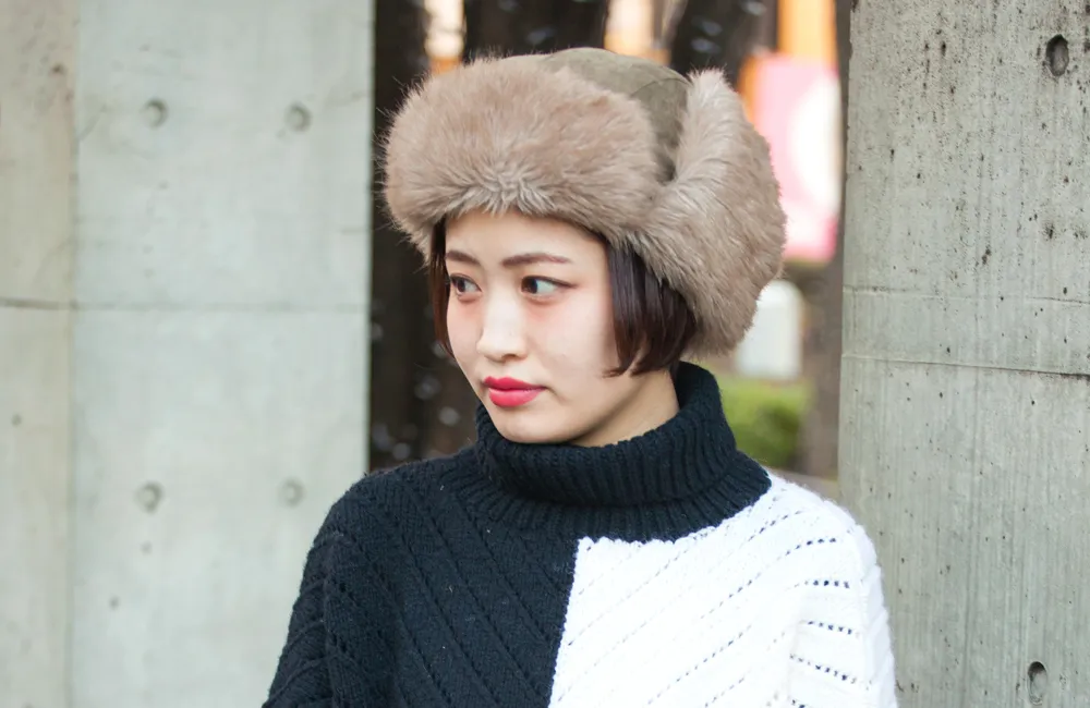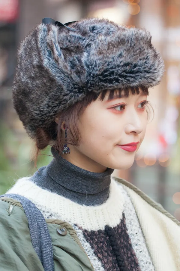 上記でロシア帽と総称したが、厳密に言うと「ロシア帽」と「コサック帽」に分かれる。前者は別名「ウシャンカ」と呼ばれ、ロシア軍などでも着用されていた“耳当てがある”帽子。後者は毛皮でツバや“耳当てがない”シンプルな円筒形で、銀河鉄道999のメーテルで有名な帽子だ。現代ではどちらも広義的にはロシア帽と呼ぶが、強いて言えば今季は耳当てが付いている物の方が人気だ。ちなみにフライトキャップは、飛行機やバイクの操縦時に着用する防寒を目的とした耳まで覆う帽子で、内側にファーやボアが付いている。印象的だったのは厳寒な日でも、ほとんどの人が耳当てを降ろさずに被っていた事。“そのままの方が可愛いから”という声を多く聞いたが、耳当てを降ろすと主張が強過ぎて、スタイリングによってはバランスを崩してしまう可能性があるからだ。