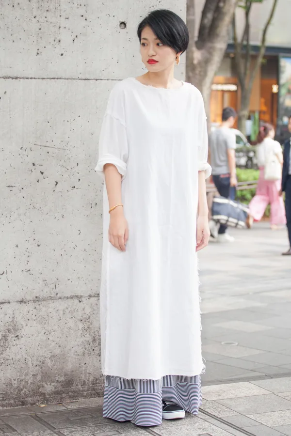 シルエットに焦点を当てると、以前まではミニマムなトップスにハイウエストのワイドパンツといった、ボトムスのボリュームを強調したシルエットが圧倒的に多かったが、今夏はそれが少しずつ変化していった。レイヤーがしやすいガウンやワンピースの登場もあって、今までタブーだったワイドにワイドを合わせるコーディネートが登場。また、一枚で十分に着られるワンピースも敢えてボトムスを履くなど、縦長のライン、つまりIラインを意識させるようなコーディネートが多くなっているのだ。