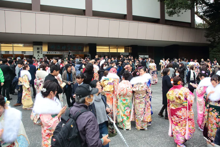 渋谷区の成人式は、渋谷公会堂の改築工事に伴い、2年前から明治神宮内にあるこの会場へ移しているが、場所がら、外国人のギャラリーも多く、今年はもう人数では成人者の親類たちを上回るくらいだった。もちろんTVニュースなどでも伝えられている通り、成人式に参加する側にも外国人が増えている。中には、昔、留学生として日本に住んでいて、成人式に出席するためだけに、わざわざまた日本を訪れたという外国人もいた。逆に現在海外留学していて、成人式のために一時帰国しているという人にも何人か出合った。
