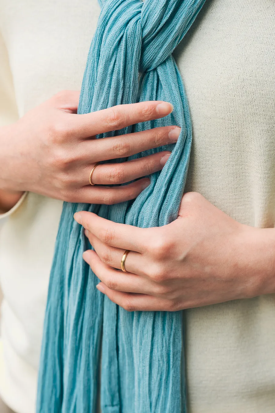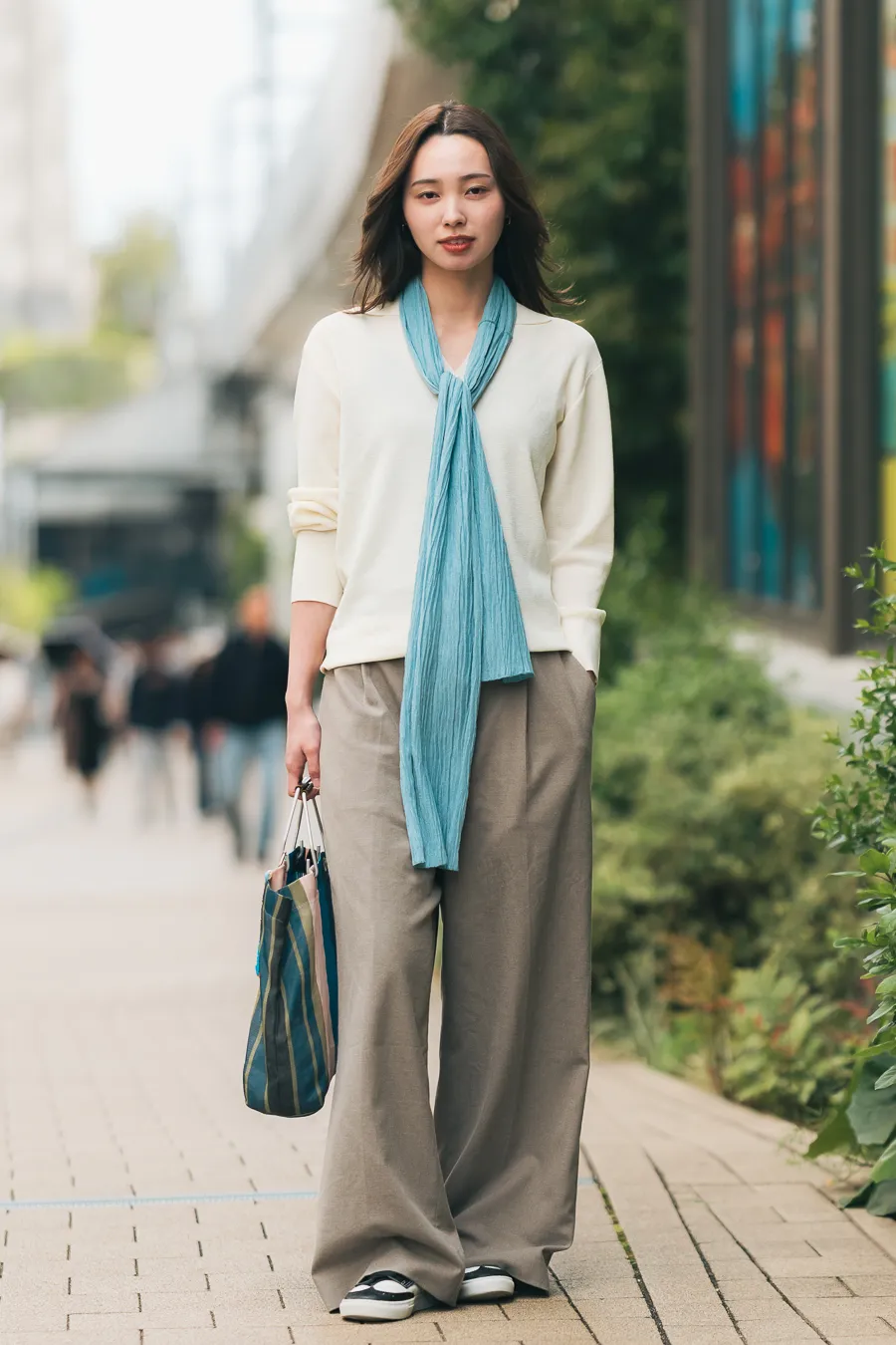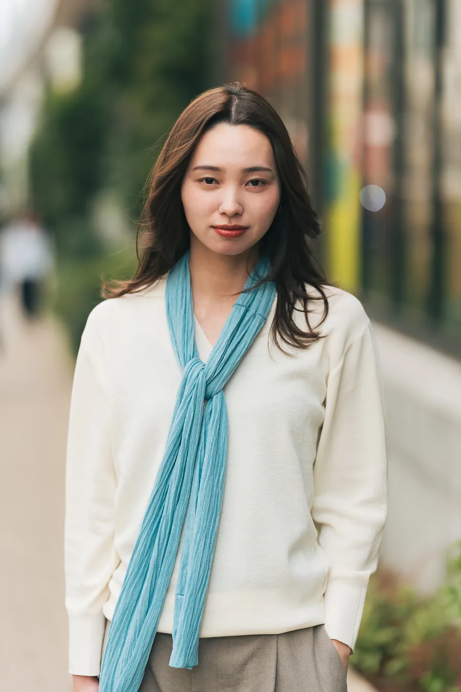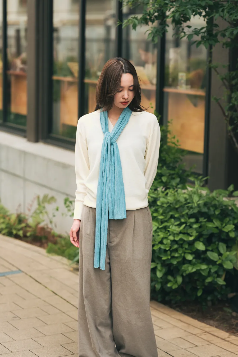 - 今日の小物へのこだわり : 服はシンプルが良くて小物(スカーフ)に色物を入れて差し色