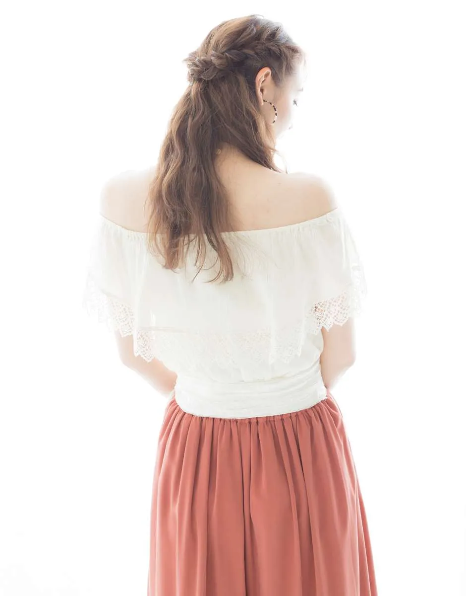 オフショルダーでリラックス感のあるフェミニンルック 16世紀、女性の表着だったワンピースドレス型上衣のローブを、オフショルダーのトップスで表現。当時は胸元や背中が広く開いたものが多く、胸や腰のふくらみを強調して女性らしさをアピールしていたとか。また、ビロードやサテン、ダマスク、タフタなどの生地で仕立てられていた。 |