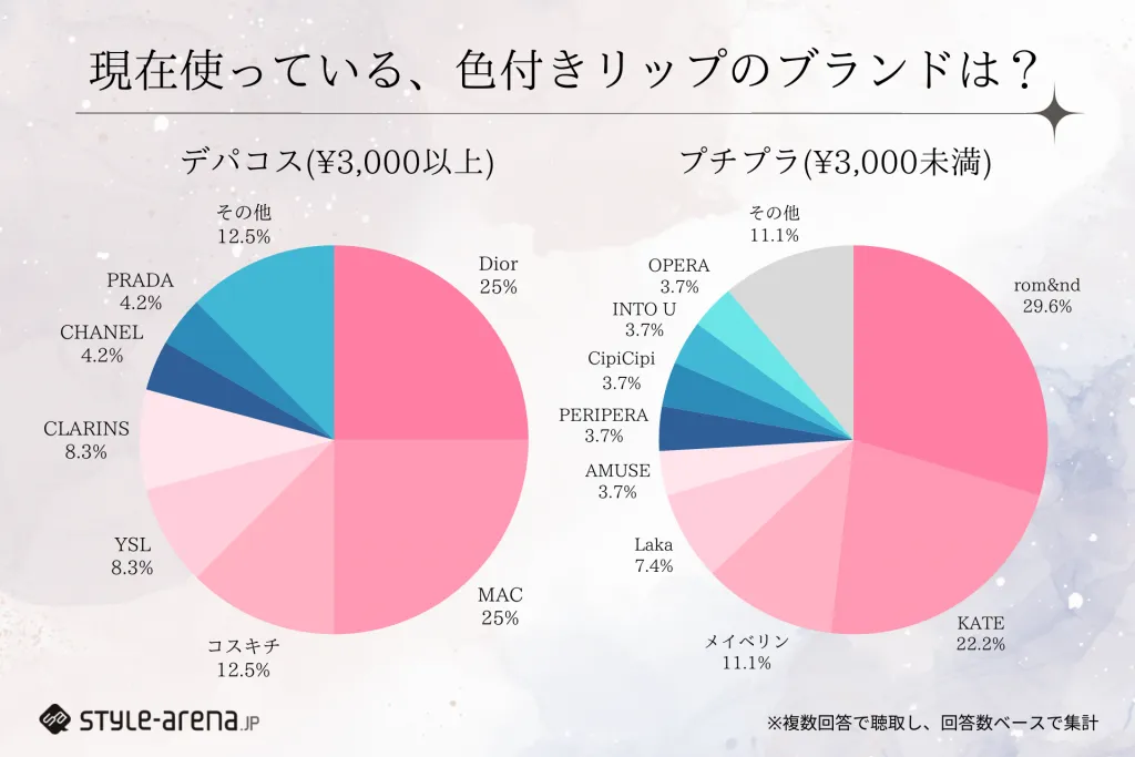 まずは「現在、使っている色付きリップのブランドをデパコス、プチプラそれぞれ教えてください。また、使っている理由も教えてください。」と聞きました。