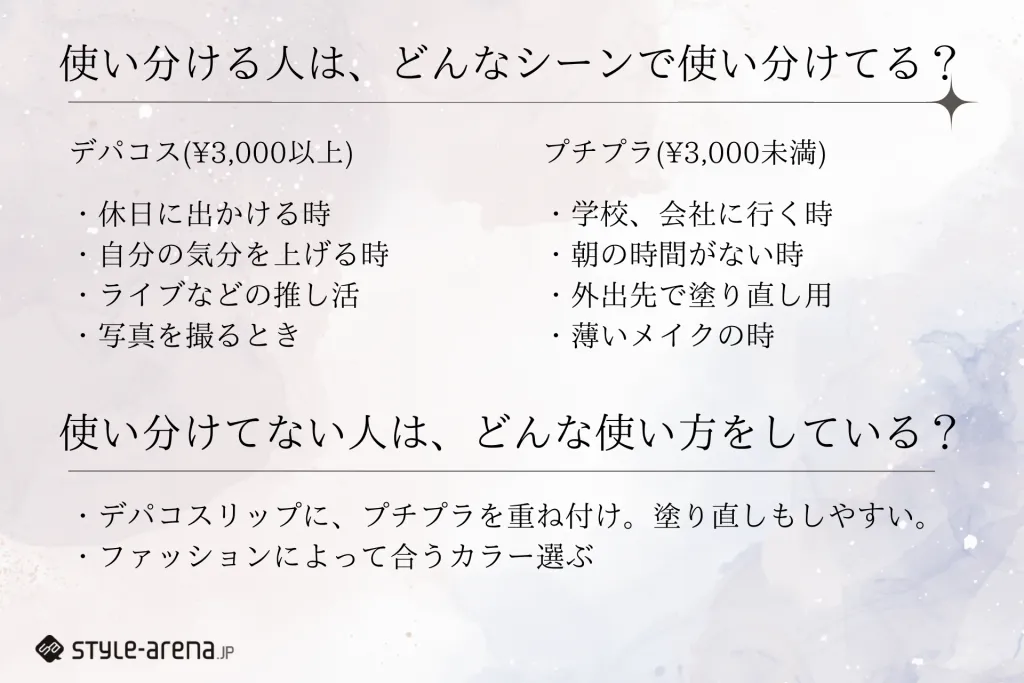 デパコスは「休日に出かける時」「自分の気分を上げる時」「ライブなどの推し活」「写真を撮るとき」など、スペシャルなシーンに使用する人が多く、プチプラは「学校、会社に行く時」「朝の時間がない時」「外出先で塗り直し用」「薄いメイクの時」といったデイリーシーンに重宝しているようです。