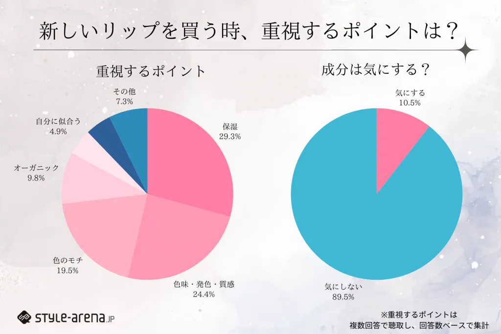そんなこだわりがある一方で「リップの成分は気にする?」という質問に対しては、「気にしない(89.5%)」とほとんどの方が成分までは重要視していないことがわかります。その理由について聞いたところ「そこまで見ていないから。だけど”ヒアルロン酸”だったり、流行りの美容成分が入っているなら使ってみたい。」とコメントがありました。