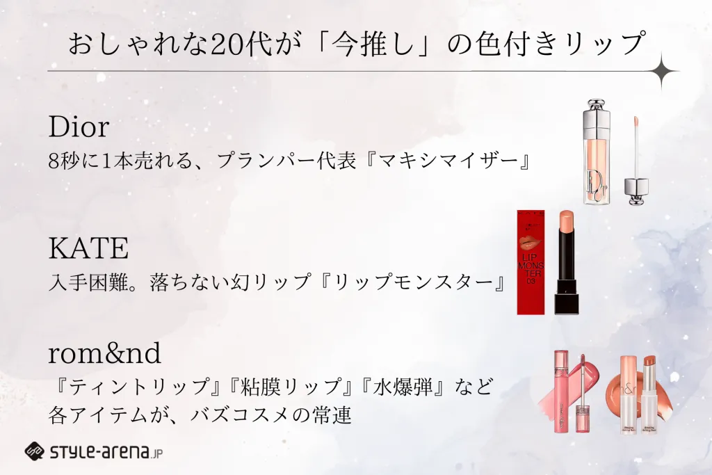 デパコス、プチプラいずれにおいても名前が上がったブランドは、SNSでよく聞くバズアイテムを生み出していることが共通点です。Diorであれば『プランパー代表・マキシマイザー』KATEであれば『落ちない幻リップ・リップモンスター』。rom&ndは『ティントリップ』『粘膜リップ』『水爆弾』など多くのインパクトのあるワードでリップトレンドを牽引してきました。