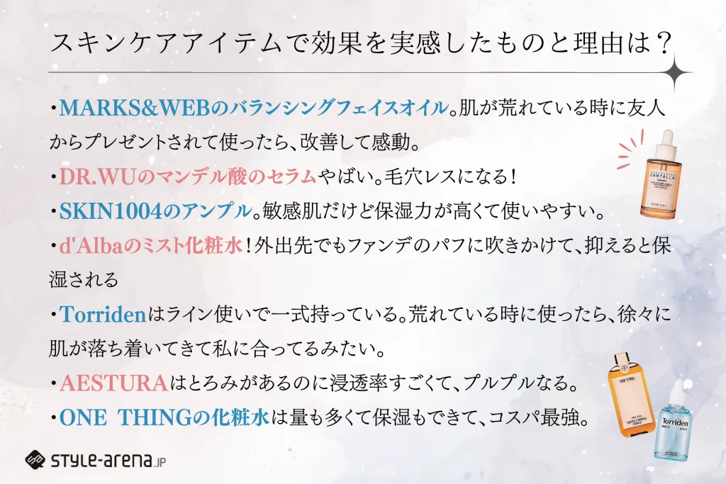 では、コスメトレンドに敏感な方達は一体どんなスキンケアアイテムを使っているのでしょうか?そこで「これまでに使用してきたスキンケアアイテムで一番効果を実感したものは何ですか?その理由も教えてください。」と質問してみました。