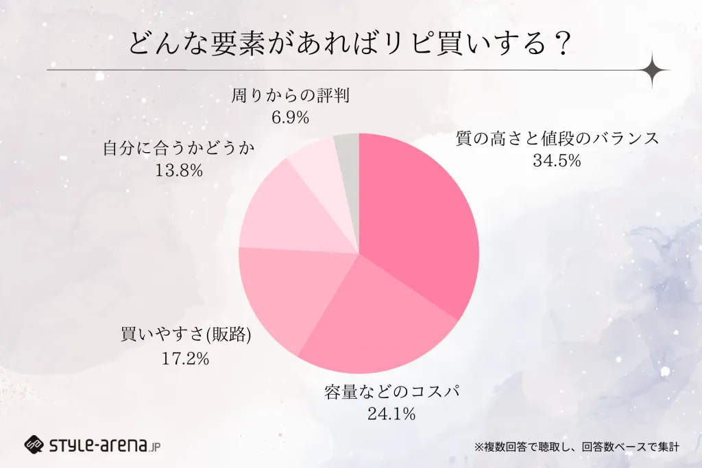 デパコス、プチプラ問わず「質の高さと値段のバランス」と答えた方が最も多く34.5%、続いて「容量などのコスパ(24.1%)」「買いやすさ(販路)(17.2%)」と続きました。特にトップに上がったコメントをした方達は「効果を実感できるなら、機能性が高いなら値段はあまり気にしない」といった答えが多数でした。もちろんコスパや、どこで買えるかなどの販路の便利さも、消費者としては気になる点といしては共感できる方も多いポイントでしょう。
